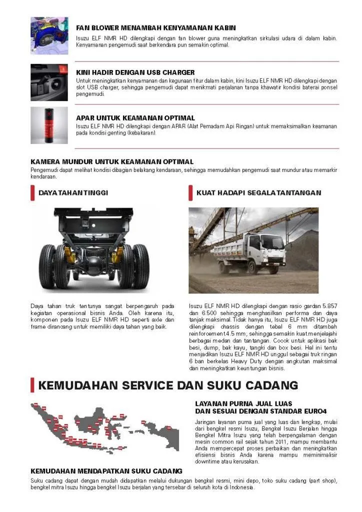 Dibekali dengan berbagai pilihan body dan mesin, Isuzu Elf menghadirkan segala solusi kebutuhan transportasi bisnis Anda, mulai dari microbus, truk ringan atau kecil sampai truk bermuatan sedang. Sejumlah fitur pada ruang kabin seperti USB port juga hadir menjadi standar yang membantu kenyamanan berkendara jarak jauh.